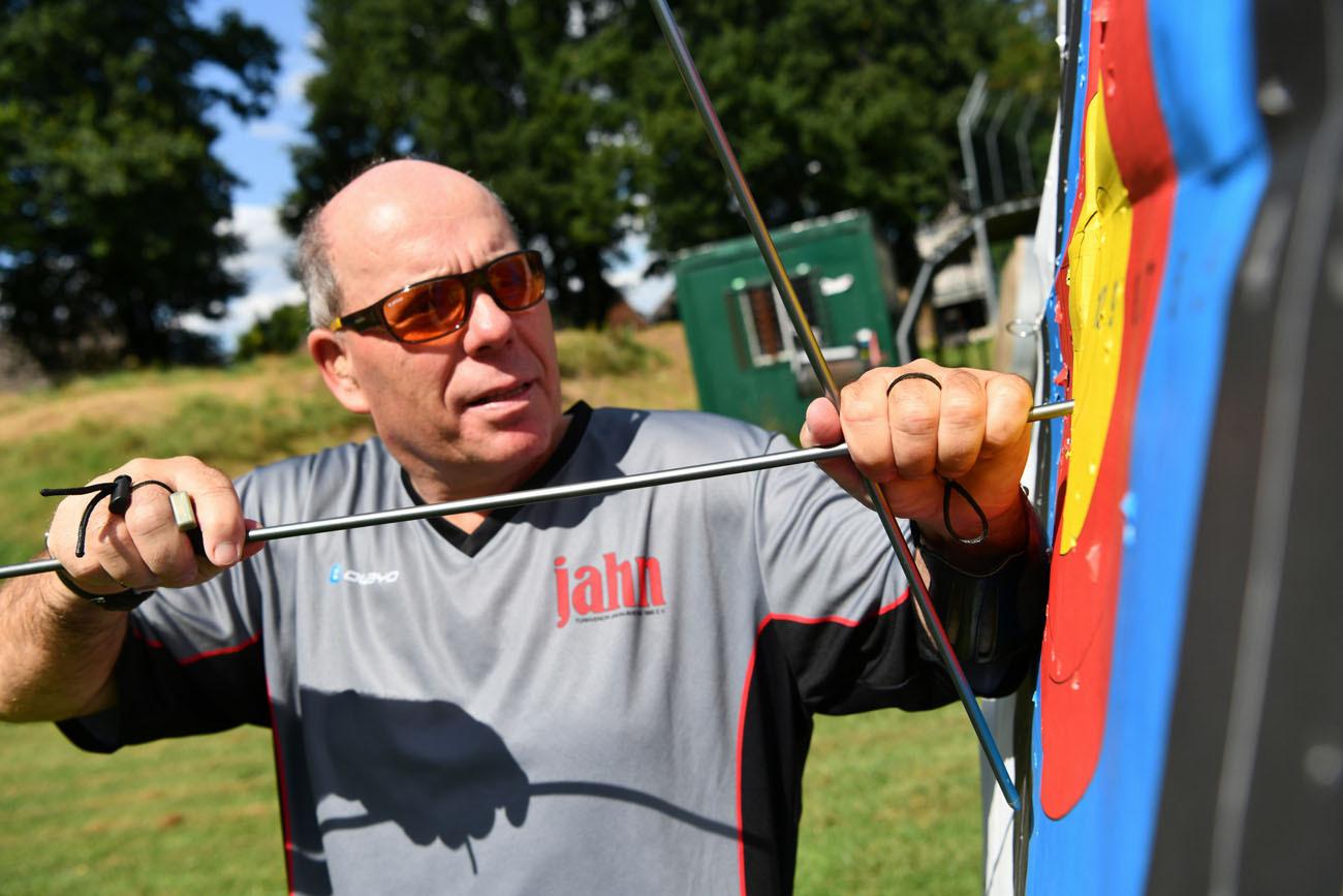 Von Unsicherheit ist nichts mehr zu sehen, Als er über den schmalen Trampelpfad zur kleinen Hütte der Bogenschützen am Rande der Wiese geht. Mit seinem Langstock nimmt er jede Unebenheit problemlos, Die Richtungswechsel hat er nach fast 16 Jahren im Verein verinnerlicht. Längst hat er wahrgenommen, wer sonst noch da ist. Von weitem hat er die Stimmen gehört. Ein ehrenamtlicher Helfer wird ihn wieder begleiten. Ein Sportschütze setzt bereits die ersten Pfeile. Auch Hülsey rüstet sich. Die Handgriffe sind geübt, Armschutz und Fingerschlaufe schnell umgelegt.