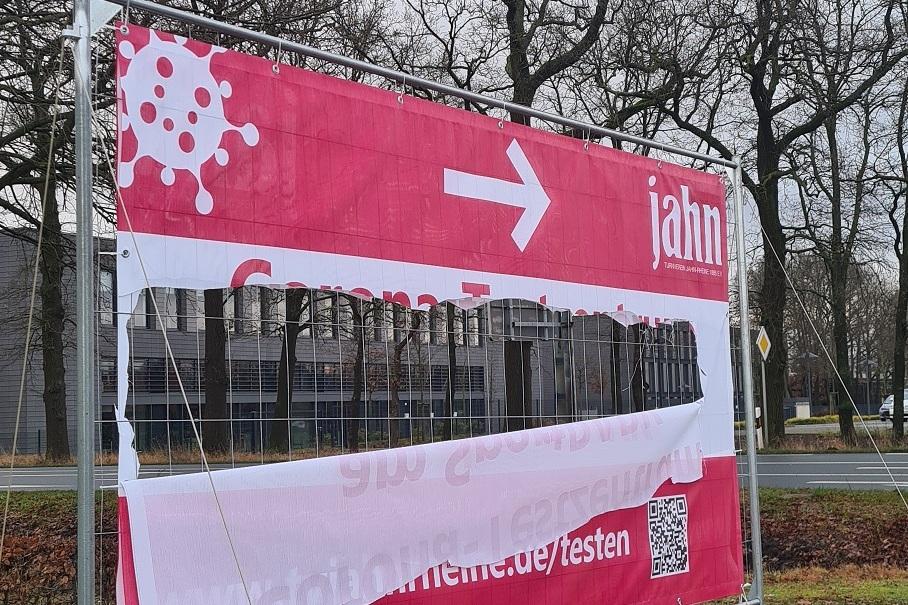 Bereits zum dritten Mal wurde das Banner des Testzentrums am SportPARK des TV Jahn-Rheine zerstört. Dieses ist an der Straße Am Disselberg an einem Ba…