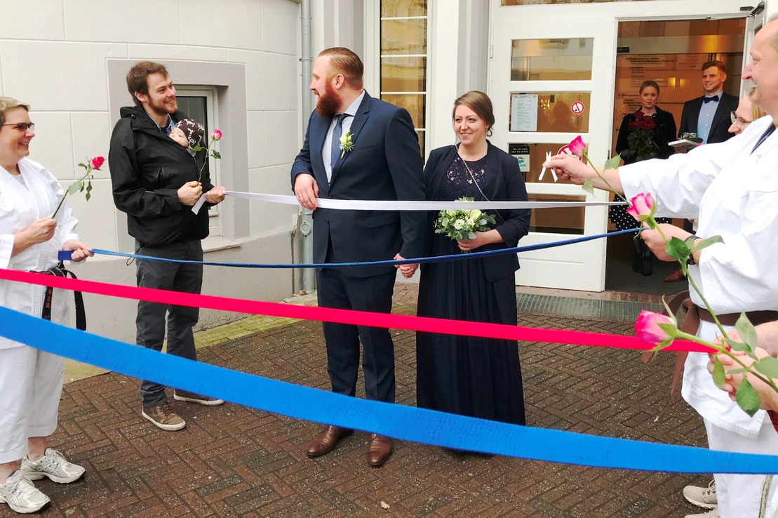 Auch an ihrer standesamtlichen Hochzeit mussten sich Christopher und Susi durch die Gürtelsperren der Karatekas kämpfen.