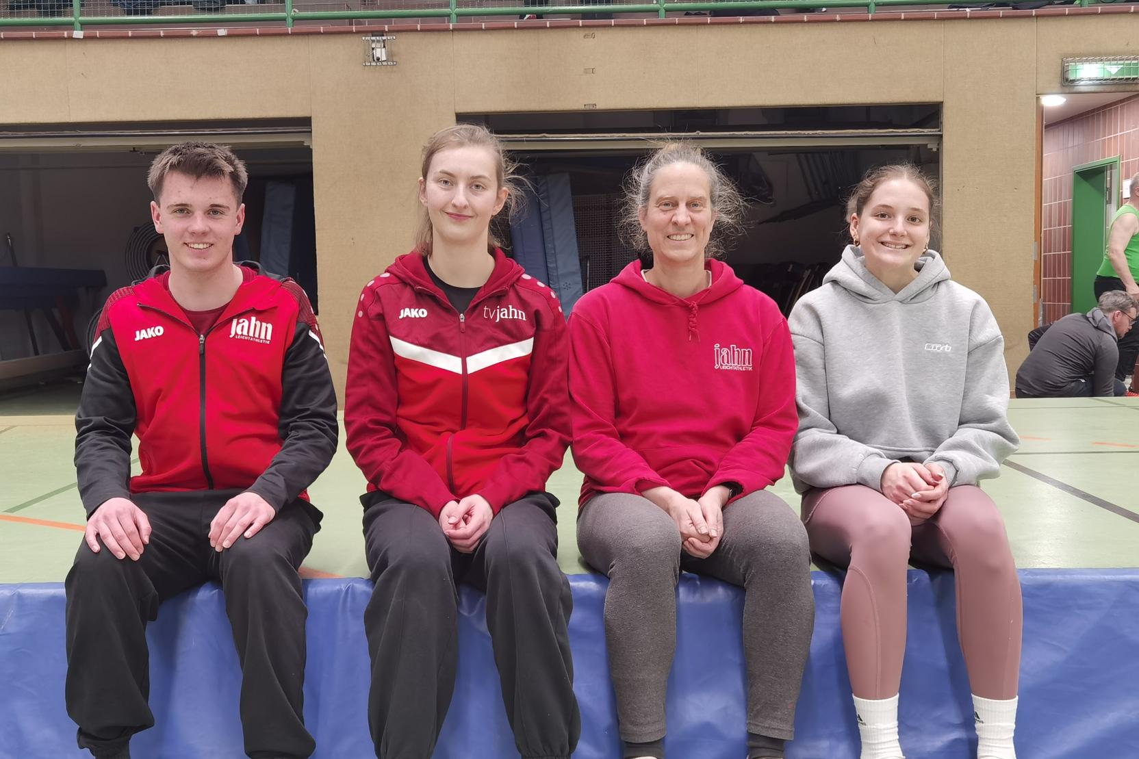 erfolgreiche Athleten des TV Jahn in Paderborn (v.l.): Philip Jürgens, Lia Hüweler, Martha Fischer und ihr Trainer Wolfgang Göcken