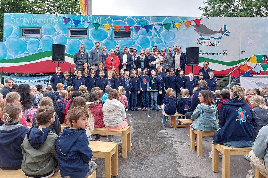Mit einem bunten Programm auf dem Schulhof der Dechant-Wessing-Schule feierten Schüler, Lehrerinnen, Helfer, Eltern und Offizielle aus Stadt, Land, Kommunalpolitik, Sportvereinen und -verbänden den Schwimmcontainer Narwali, der für fünf Wochen in Hoetmar steht. Foto: Kleigrewe