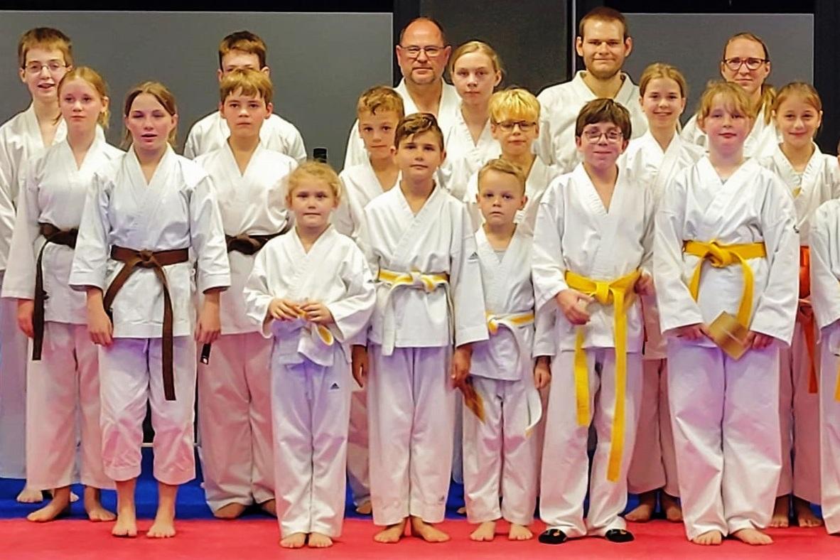 18 Kinder traten an und zeigten was sie gelernt haben. Tim Maier, Klara und Lutz Koepernick zeigten bei der Prüfung zum 9. Kyu-Grad gute Leistungen und Rainer Klönne bescheinigte Ihnen gleichzeitig die bestandene Zwischenprüfung zum Weiß-Gelb-Gurt. Collin Manghofer, Leni Wältring und Ylvie Martin tragen nun mit dem 8. Kyu-Grad denGelbgurt und Celina Wältring und Laura Uphaus mit dem 7. Kyu-Grad den Orangegurt. Die Zwischenprüfung zum Orange-Grün-Gurt bestanden Emily Knoop und Leon Hespeling. Mandy Mersch, Johann Steggink und Leon Muhr überzeugten bei der Prüfung zum 6. Kyu und tragen nun grün. Dem Schwarzgurt näher gekommen sind Florian Düsing, Linus Hespeling, Anna und David Pfeifer, die den 3. Kyu-Grad bestanden und nun den Braungurt tragen. Für Paulinka Mersch ändert sich die Farbe nicht, es bleibt bei braun. Denn daran erkennt man Karate-Schüler der Oberstufe vom 3. bis 1. Kyu-Grad. Nun kann sie sich auf die Danprüfung vorbereiten, die neben anderen Voraussetzungen eine Vorbereitungszeit von mindestens einem Jahr nach bestehen des 1. Kyu-Grades erfordert. Die Prüfung bestand aus Grundschultechniken, die in der Gruppe vorgeführt werden. Es müssen jeweils 1 – 2 Kata (festgelegte Übungsfolge) vorgeführt werden und Partnerformen. Besonders bei den Partnerformen steigen die Anforderungen von Prüfung zu Prüfung. In der Oberstufe müssen die Techniken kraftvoll, dynamisch und mit bester Koordination ausgeführt werden. Wie alle Karate-ka müssen auch die Kinder lernen effektive Verteidigungs- und Kontertechniken mit größter Kontrolle so auszuführen, dass es nicht zu Verletzungen kommt. Zu den wichtigsten Regeln gehört neben Respekt und Höflichkeit der Gesundheitsschutz für einander.
