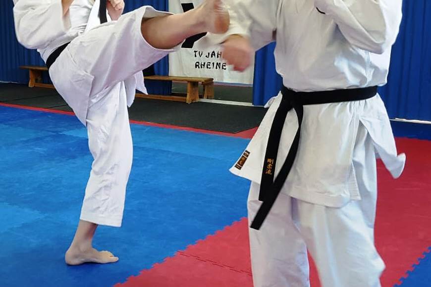 jeden Sportbegeisterten. Vorbereitet zu sein auf den einen möglichen Ernstfall hat viele Karatekas zum Weitermachen und Durchhalten über Jahre hinweg motiviert. Nach den gravierenden pandemiebedingten Einschränkungen in den letzten zwei Jahren haben auch die Kampfsportler den normalen Trainingsbetrieb wieder aufgenommen und freuen sich auf Neuzugänge in allen Jugend- und Erwachsenengruppen. Wer über Karate mehr erfahren möchte, kann ab dem 31.05.2022 jeweils dienstags und donnerstags in der Zeit von 20:00 bis 21:30 Uhr im Sportpark des TV Jahn Rheine an einem Anfängerkurs teilnehmen. Bis zu den Sommerferien werden sechs Trainingseinheiten für Erwachsene angeboten, in denen Karate-Grundlagen vermittelt werden. Begonnen wird mit dem Erlernen von einfachen Grundtechniken. Schlagtechniken und Tritte gehören ebenso zum Programm wie Würfe und Hebel. Eines der Hauptziele ist es, sich gegen einen mutmaßlich körperlich überlegenen