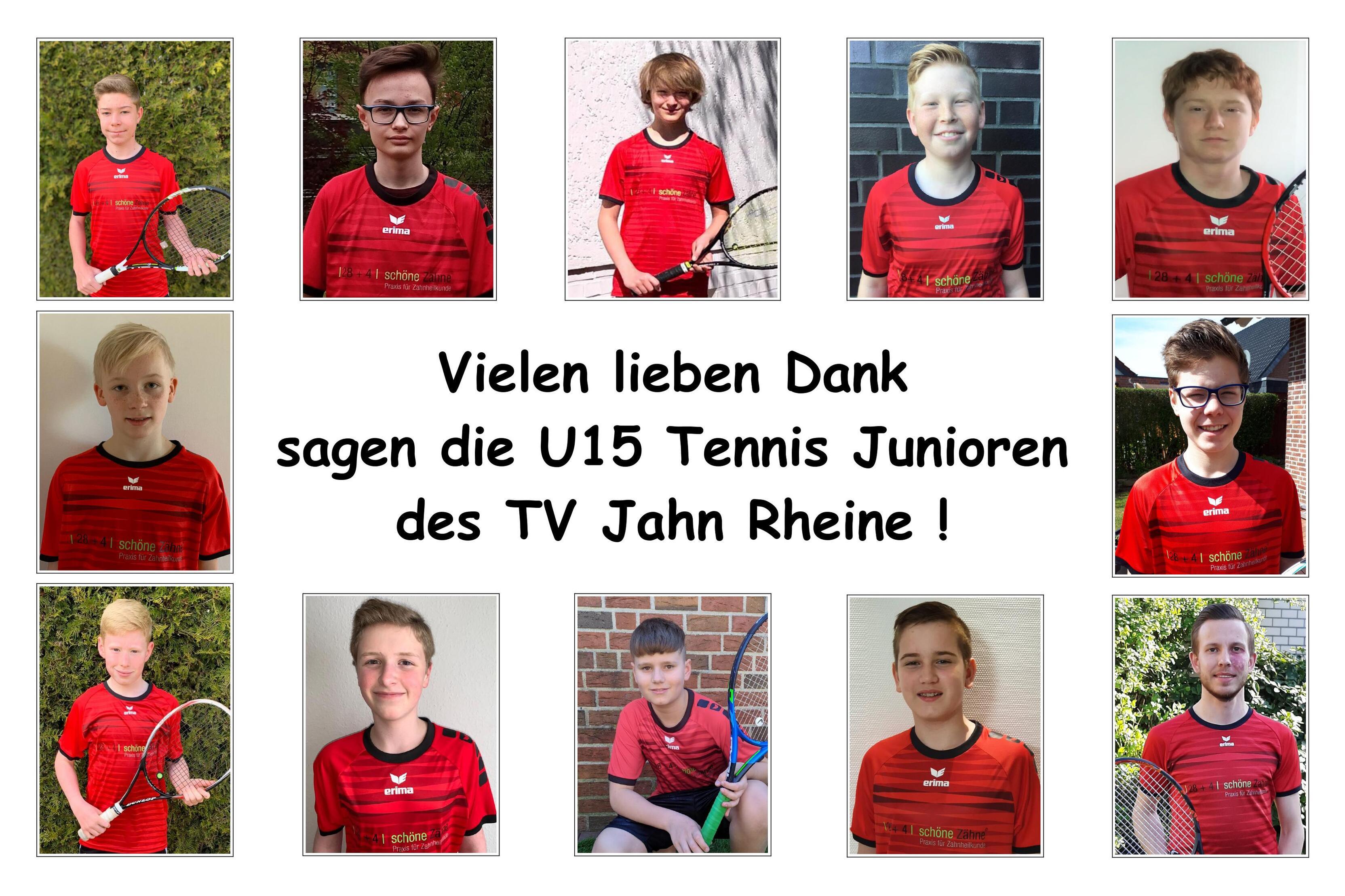 Die U15 Tennis Junioren freuen sich über die Anschaffung der neuen Jahn Trikots und bedanken sich herzlich bei den Sponsoren Dr. Peter Weichel - "28+4 schöne Zähne - Praxis für Zahnheilkunde" und Schuh- und Sport Grevinga.