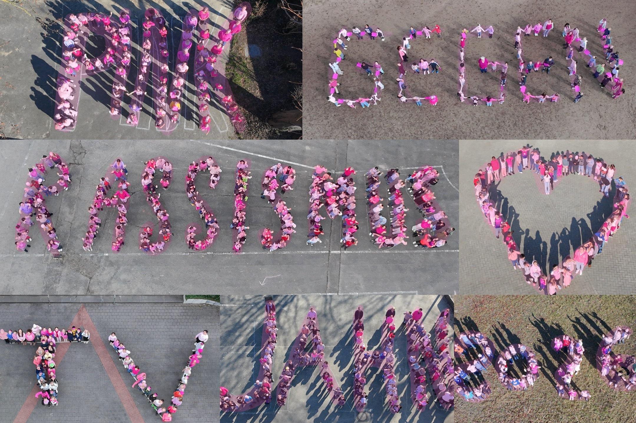 Ein Höhepunkt der Aktion war eine gemeinsame Drohnenfoto-Aktion an den sieben Standorten. Die Kinder stellten sich so auf, dass aus der Vogelperspektive Worte entstanden, die später zu einer großen Collage zusammengefügt wurden. Die Botschaft ist klar: „Pink gegen Rassismus 2026 – TV Jahn ♥“