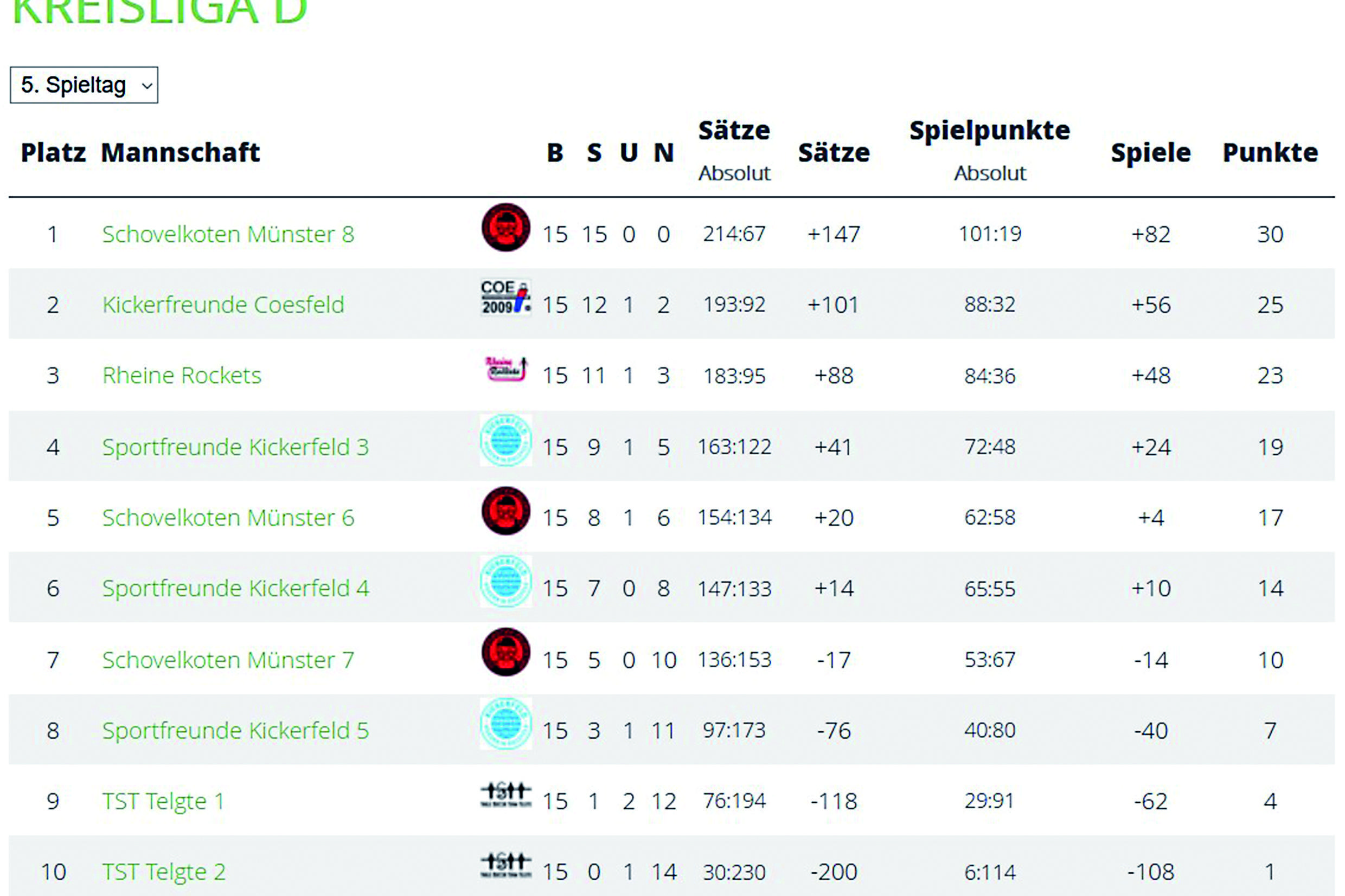 Da die Rockets (23 Punkte) die Begegnung gegen den Tabellenführer Schovelkoten 8 (30 Punkte) aus Münster knapp mit 3:5 verloren, sind diese nicht mehr einzuholen. Und auch der 2. Platz, der im Vergleich zu den anderen drei Kreisligen eventuell als Aufstiegsplatz in die Bezirksliga reichen würde, käme man unter die zwei besten Zweitplatzierten, ist nun aus eigener Kraft nicht mehr zu erreichen. Man schlug zwar in der 3. Begegnung die 7. Mannschaft der Münsteraner Tischfußballer deutlich mit 7:1 und kann so rein rechnerisch immer noch den 2. Platz erreichen, ist aber auf die Mithilfe anderer Mannschaften angewiesen, die dem derzeitigen Tabellenzweiten Kickerfreunde Coesfeld (25 Punkte) am letzten Spieltag unbedingt Punkte abnehmen müssen, hat man doch im direkten Vergleich momentan das deutlich schlechtere Satzverhältnis.