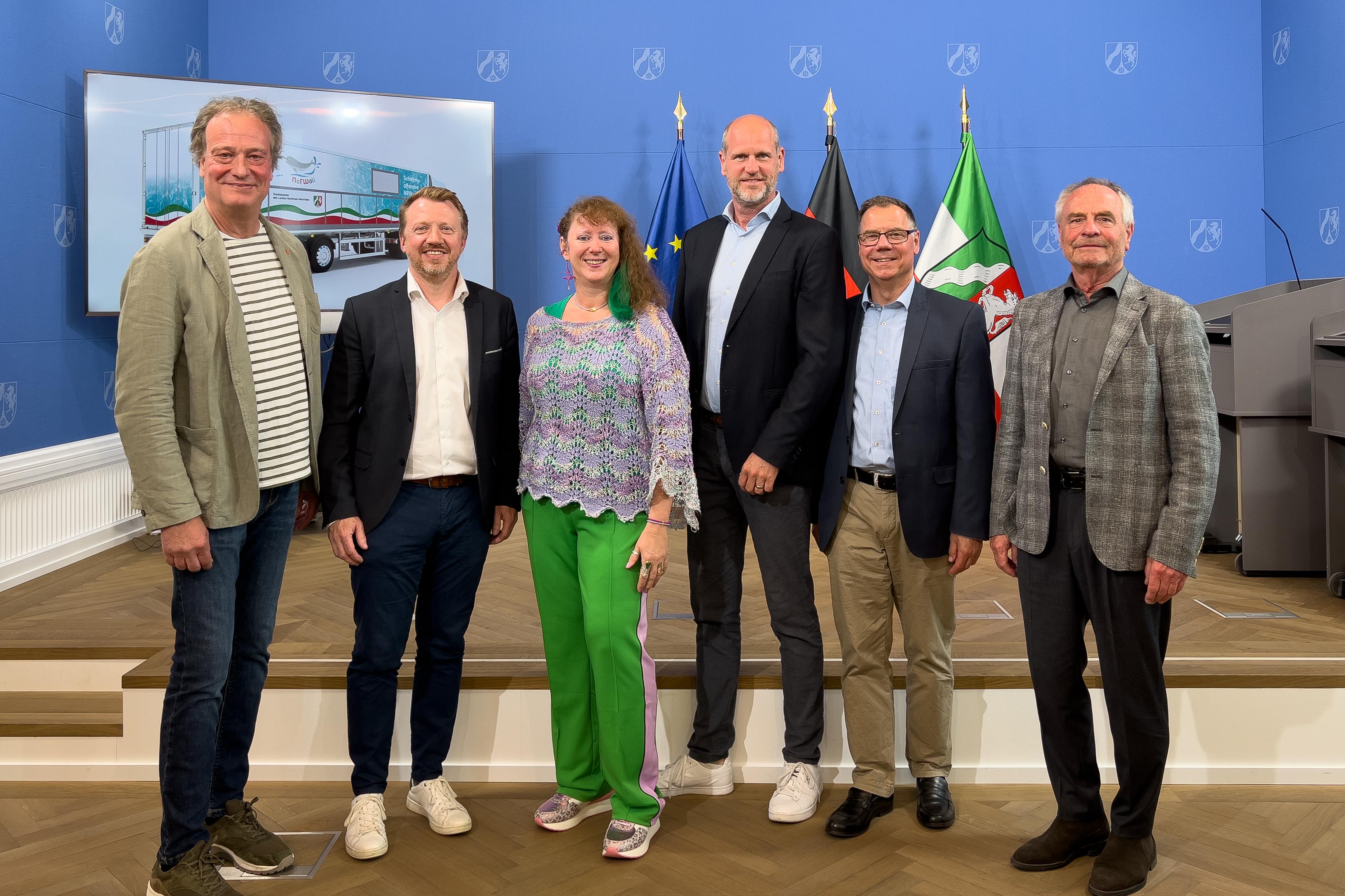 Die Staatssekretärin für Sport und Ehrenamt Andrea Milz hat am Montag, 22. Mai 2023, das Modellvorhaben mobile Schwimmcontainer „narwali“ zusammen mit den Projektträgern vorgestellt und das Logo des Modellvorhabens präsentiert.