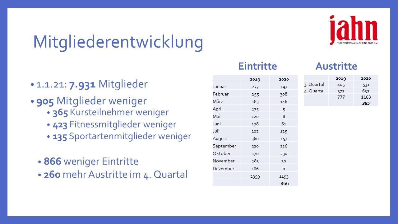 Am 1.1. hatte unser Verein 905 Mitglieder weniger als 1 Jahr zuvor. Besonders stark fallen die fehlenden Eintritte ins Gewicht.