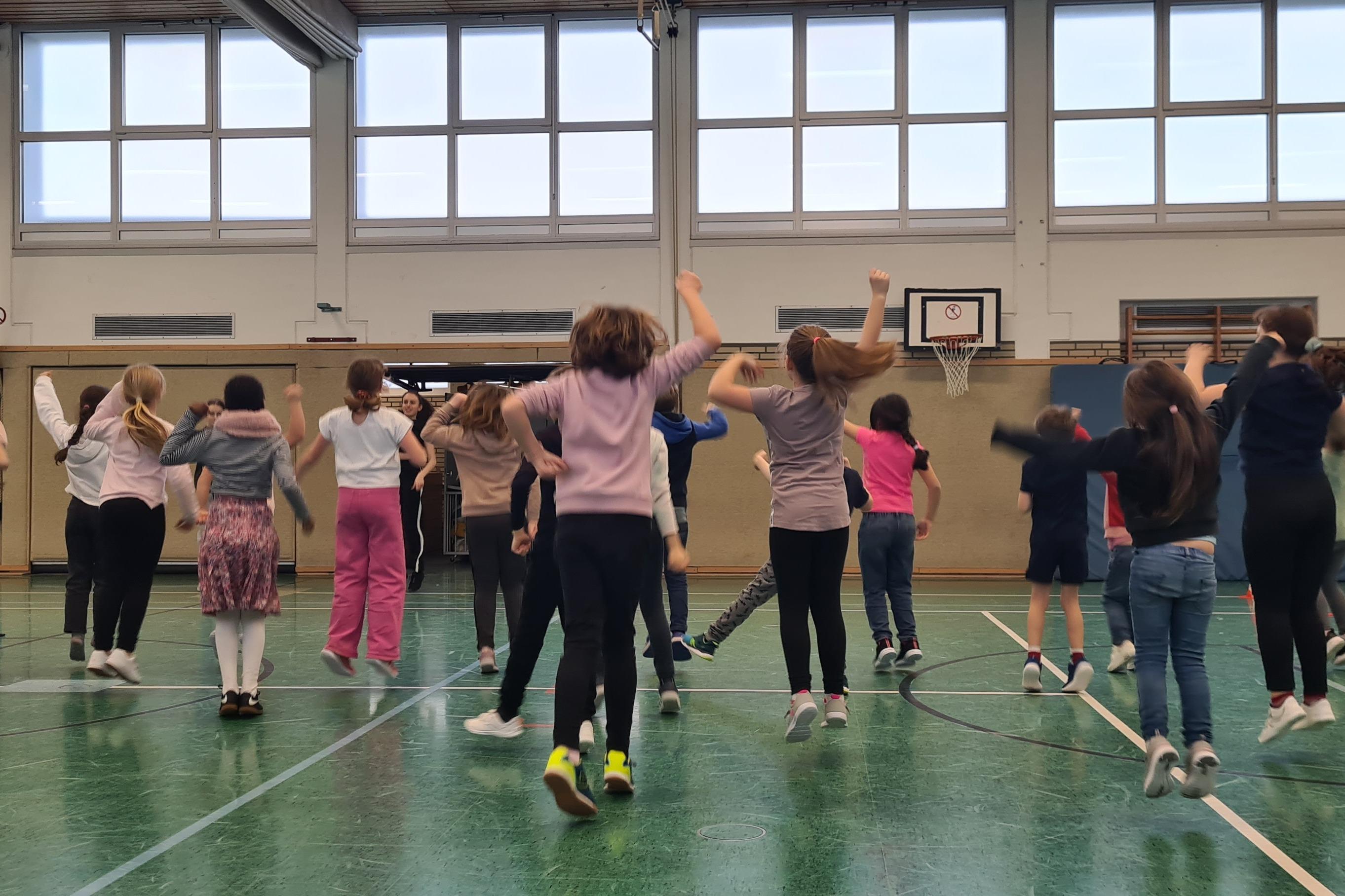 Unsere Kinder, wie sie fleißig für den Flashmob ,,Pink gegen Rassismus" proben. Am Samstag, dem 25. März ist ein Aktionstag, an dem deutschlandweit Vereine, Kitas, Schulen, etc. teilnehmen und damit öffentlich auf dieses Thema aufmerksam machen. Die Botschaft heißt "Wir bewegen uns zusammen gegen Rassismus" - für 100 % Menschenwürde. Unser Kolleg:innen aus dem "Team Bewegung" unserer 7 OGSen, haben sich vorgenommen, mit den Kindern an dieser Aktion teilzunehmen.