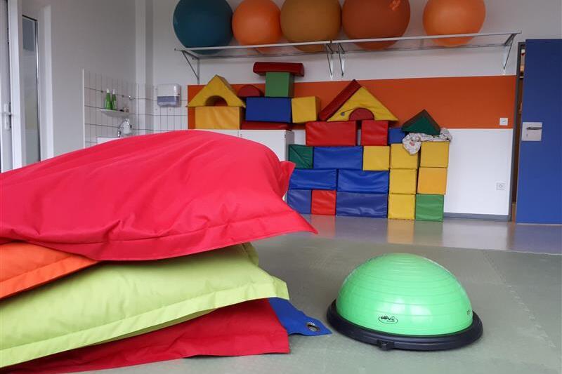 Es stehen Gymnastikbälle, Balancierkissen, große Schaumstoff- Bausteine, Matten, Decken und vieles mehr zur Verfügung. Daraus werden beispielsweise sehr gerne Höhlen oder Bewegungsparcours aufgebaut.