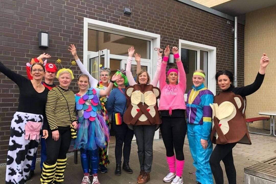 Großen Spaß hatten alle Kinder und Betreuer der OGS und ZB bei unserer Karnevalsfeier am Freitag, den 9. Februar. In der Sporthalle unserer Schule startete die ZB um 12 Uhr, die OGS (1. + 2. Klasse um 14 Uhr. Alle Kinder und Betreuer kamen bunt verkleidet, z. B. als Prinzessinnen, Cowboys, Einhörner und Clowns. Die Dritt- und Viertklässler haben in der Mensa gefeiert, die vorher mit bunten Girlanden und Luftballons geschmückt wurde. Wir haben verschiedene Spiele wie Zahlentanz und Stoptanz gespielt. Es herrschte eine ausgelassene Stimmung und Alle waren von der Party begeistert. Zur Stärkung gab es für alle Kinder Chips, Flips und Salzbrezel.