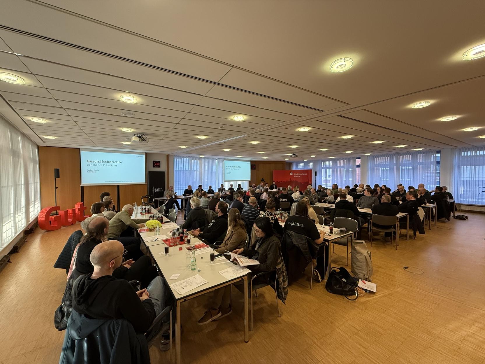 Um 18:04 Uhr eröffnete der Vorstandsvorsitzende Ralf Kamp die Vertreterversammlung, die am 26.03.2026 in der Sparkasse Rheine stattfand. Präsident Stefan Gude blickte in seinem Bericht auf das vergangene Jahr zurück und hob insbesondere das 140-jährige Bestehen des Vereins hervor. Dieses Jubiläum sei nicht nur Anlass zur Freude, sondern auch Auftrag, die Werte des Vereins weiterzutragen. Besonders betonte er die große Treue der Mitglieder sowie das Engagement zahlreicher Ehrenamtlicher, Übungsleitenden und Mitarbeitenden.