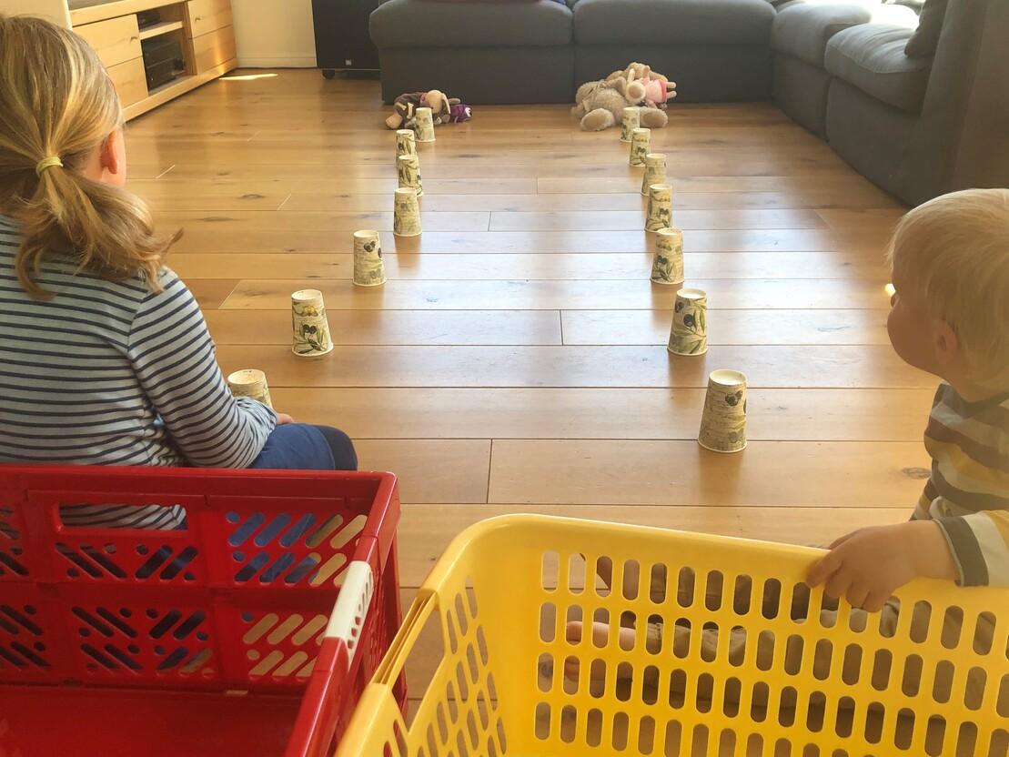 Bei diesem Spiel geht es um Schnelligkeit. Wer schafft es als erster alle Kuscheltiere durch den Parcours in den Korb zu transportieren. Auf dem Hinweg wird über die Becher gekrabbelt und auf dem Rückweg mit dem Kuscheltier im Slalom gerannt.