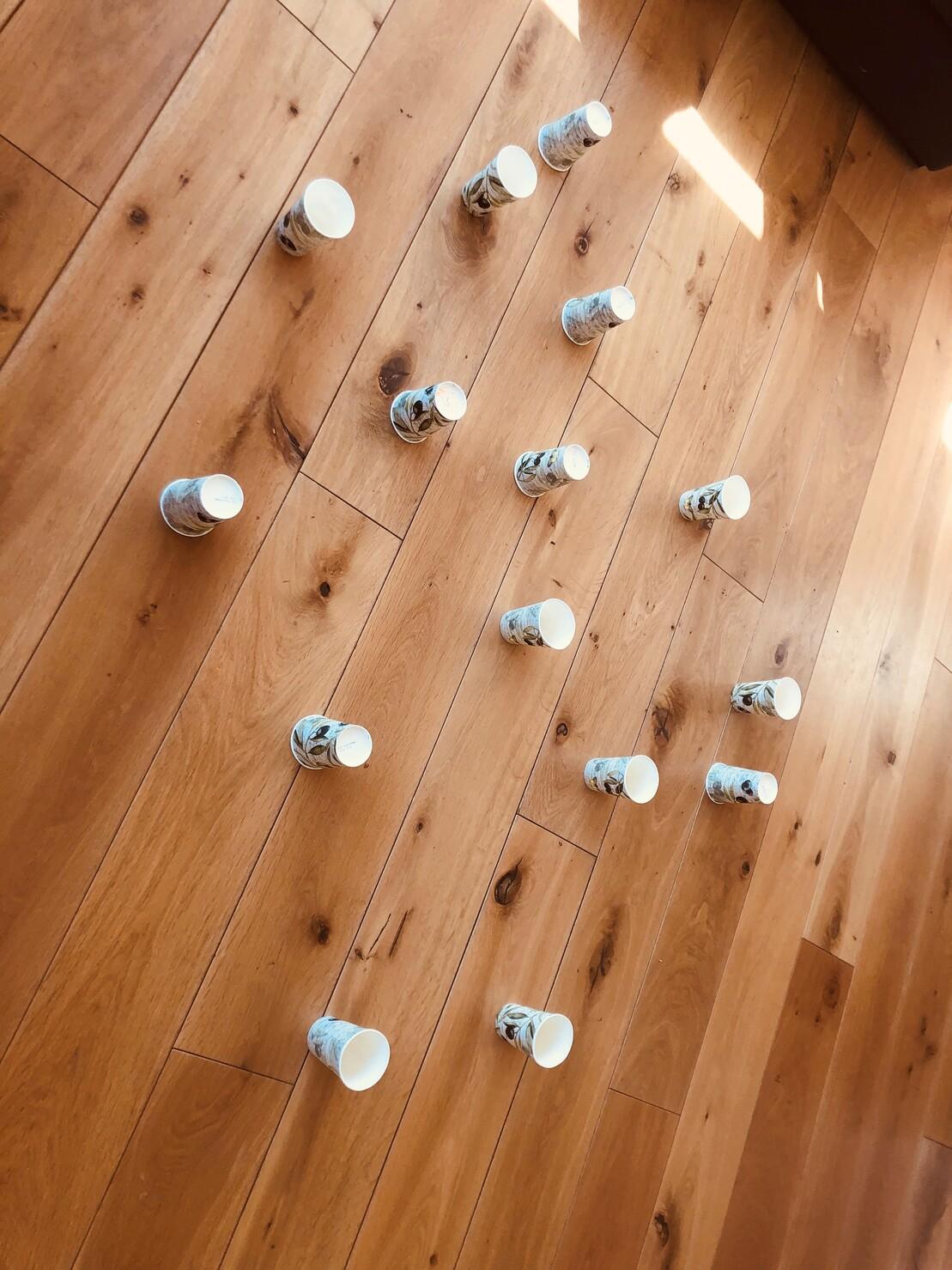 Zwei Kinder/Erwachsene spielen gegeneinander. Einer versucht die Becher richtig herum zu stellen und der Andere versucht sie falsch herum zu stellen. Ihr habt eine Minute Zeit!Los geht’s!
