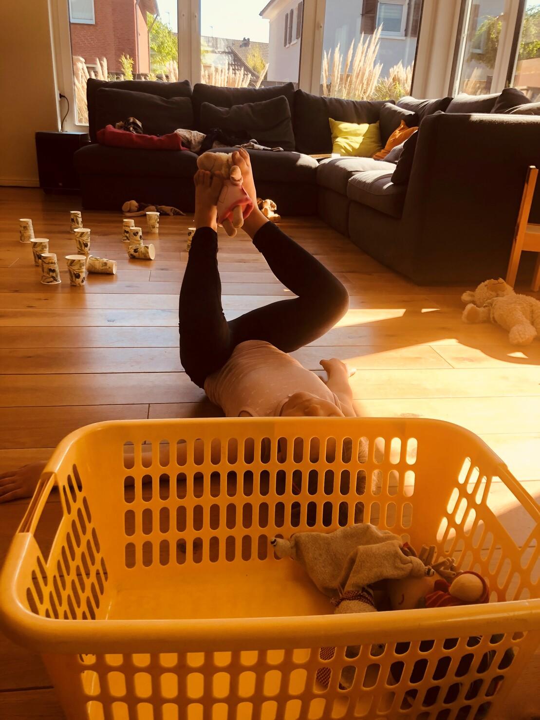 Das ist richtiges Training!Versucht die Kuscheltiere mit euren Füßen in den Korb zu legen!