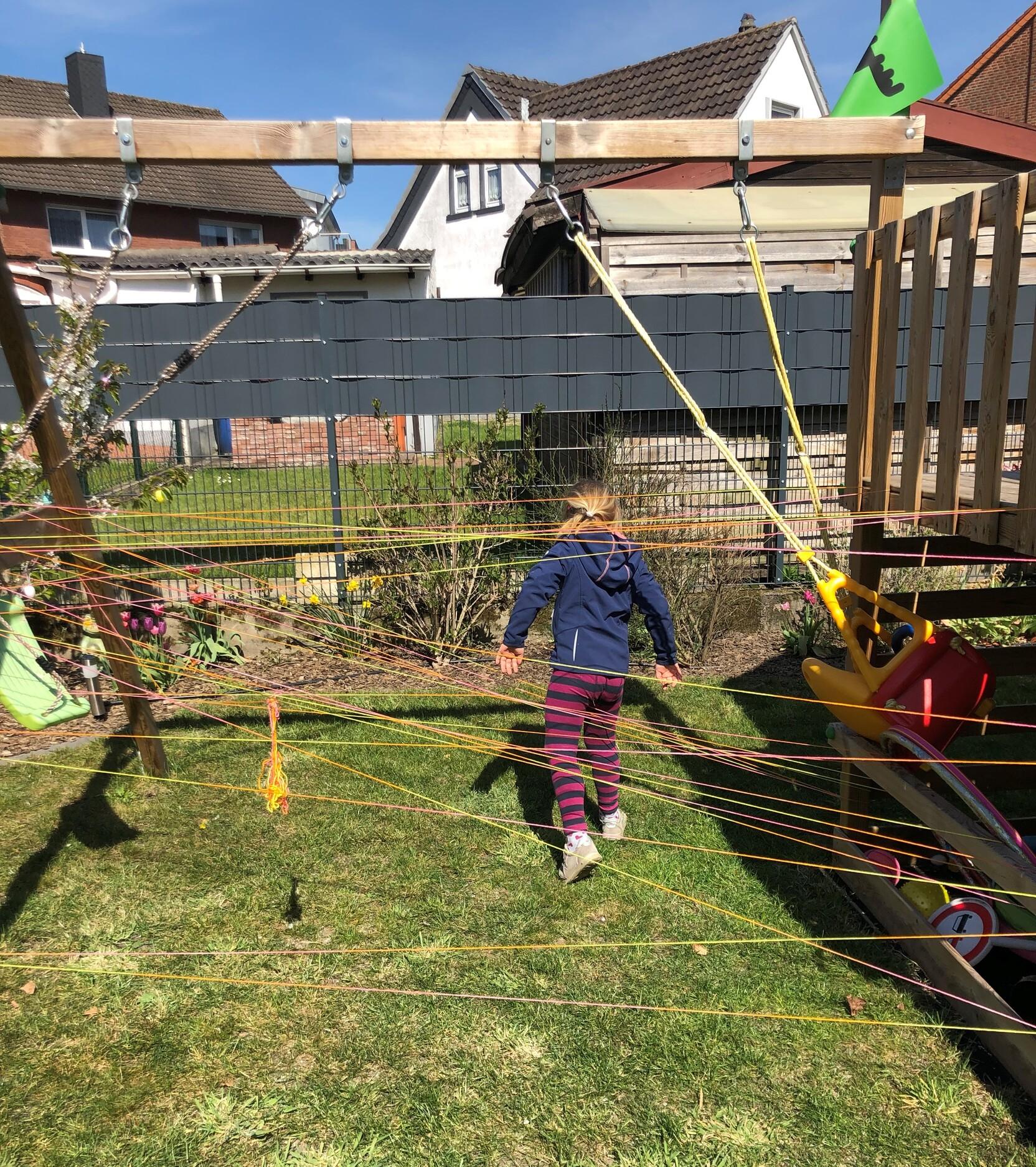 Spanne das Seil im Garten auf. Nutze hierfür verschiedene Spielgeräte, Bäume, Zäune, oder was euer Garten so her gibt.