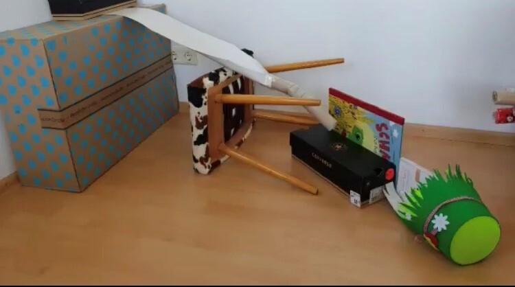 Baue mit den Gegenständen eine abfallende Konstruktion auf. Klebe Papier, Zewa-Rollen aneinander. Hier kann die Murmel später durchrollen. Nun befestige die Papier-Rollen auf deiner aufgebauten Konstruktion und lasse die Murmeln hindurch rollen.