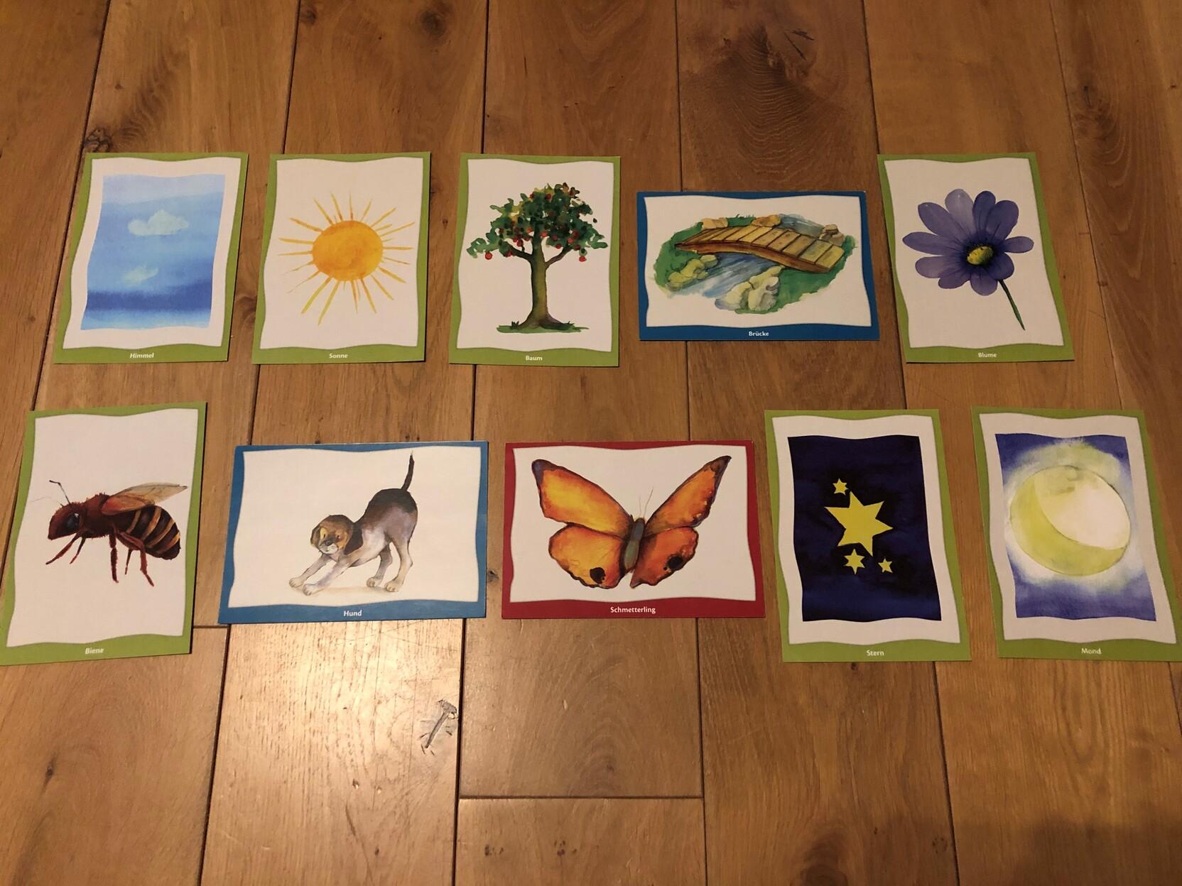 Die Sonne (Karte Sonne)schien mit ihren schönsten Strahlen und wärmte uns nach dem langen Winter nun. Auf unserem Frühlingsspaziergang kamen wir nun an einem Baum(Karte Baum)vorbei. Diesen schauten wir uns ein wenig näher an. Es waren schon die ersten Blüten zu sehen. Danach gingen wir über eine Brücke (Karte Brücke) und entdeckten am anderen Ufer eine wunderschöne Blume (Karte Blume). Sie duftete herrlich. Als wir näher herangingen, flog eine Biene aus der Blume heraus. Das waren die ersten Frühlingsboten. Die Biene entdeckte auch ein kleiner Hund (Karte Hund), der neugierig angelaufen kam. Er versuchte die Biene zu fangen und scheuchte dabei einen Schmetterling(Karte Schnetterling)auf. Dieser flog hoch in den Himmel. Erst da bemerkten wir, dass es schon langsam dunkler wurde. Die ersten Sterne (Karte Sterne) waren schon zu sehen und auch den Mond entdeckten wir nun. Es war ein wunderschöner Frühlingstag mit vielen schönen Entdeckungen.
