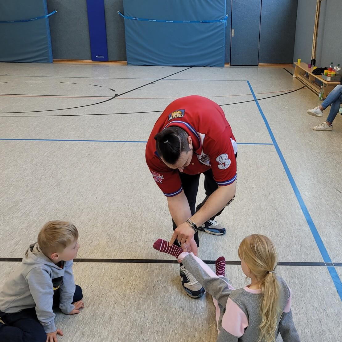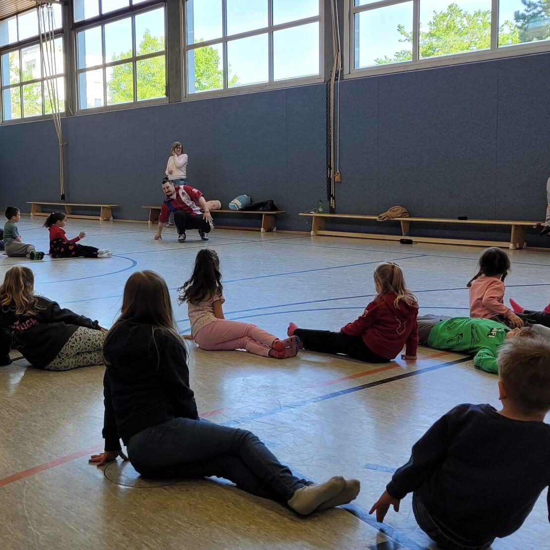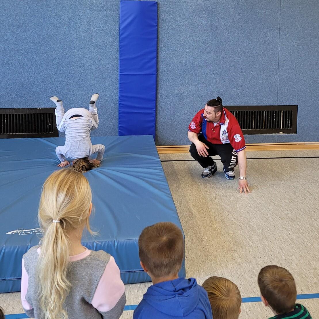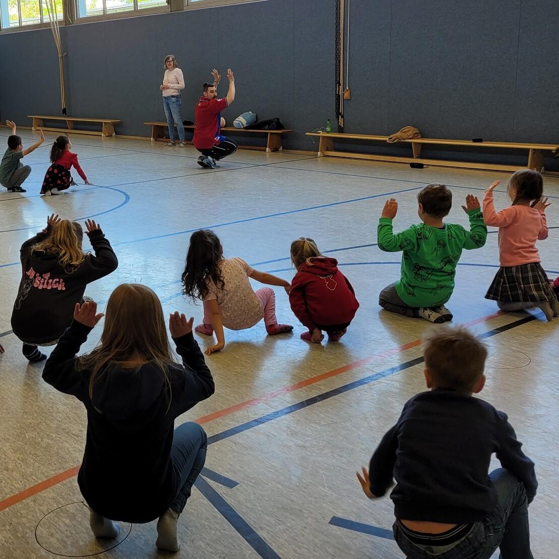 Er zeigte den Kindern verschiedene Schritte und bestärkte sie darin, etwas Neues zu probieren. Am Ende der Stunde trauten sich sogar einige Kinder an einen Kopfstand heran.