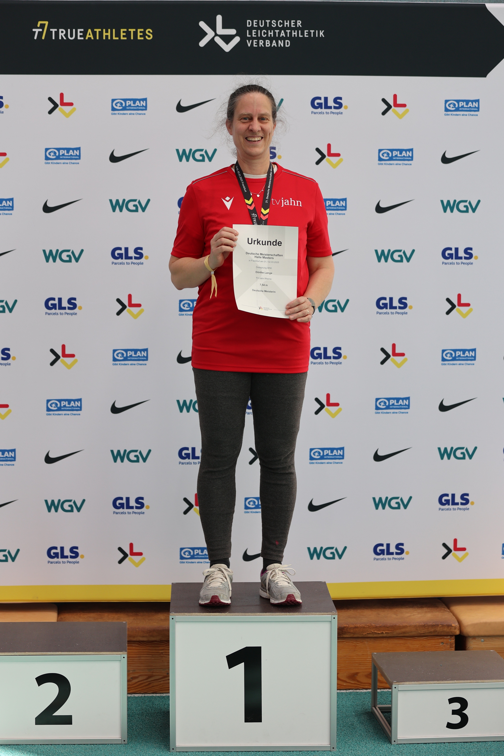Es gelang ihr beim Einspringen zum Glück schnell, ihren Anlauf einzustellen und auch problemfrei zu springen. Lange eröffnete als erste Springerin den Wettkampf der Altersklassen W35-50 im Dreisprung. Ihr erster Sprung ging auf 7,45 m, einer Weite, die sie sich vor kurzem noch nicht hatte vorstellen können. Im zweiten Sprung steigerte sie sich auf 7,54 m und auch der dritte war mit 7,46 m nur wenig kürzer. Nach einem ungültigen Versuch, wo sie im Anlauf zu viel wollte, verließ sie aufgrund der Trainingsdefizite langsam die Kraft. Trotzdem war auch der fünfte Sprung mit 7,31 m noch über dem eigentlich angestrebten Ziel von 7 m. Den letzten Sprung brach sie nach einem missglückten Step ab, um ihren Fuß zu schonen. Deshalb wurden zum Abschluss auch nur 6,11 m gemessen. Überglücklich nahm sie bei der Siegerehrung die Goldmedaille für den deutschen Meistertitel entgegen.