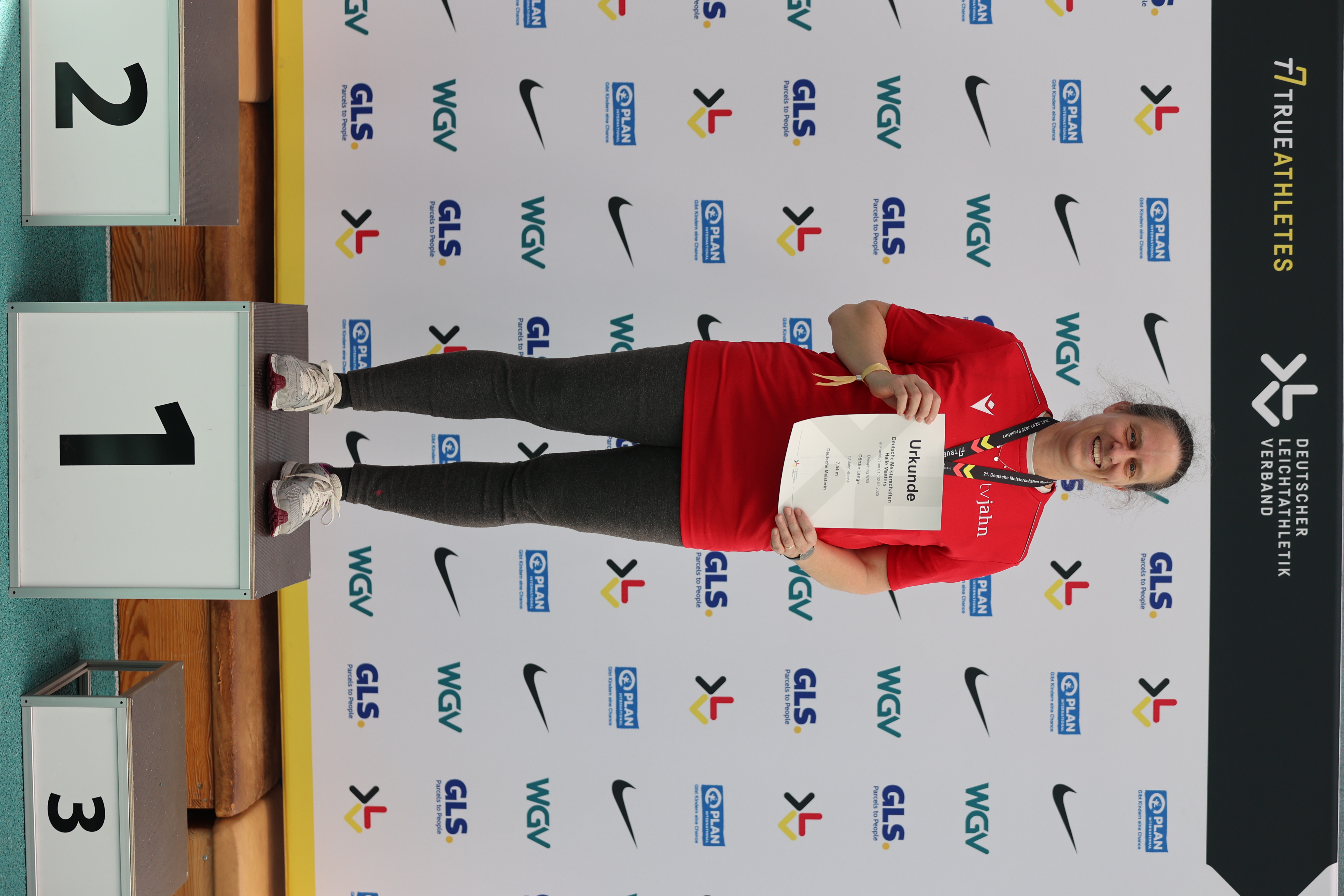 Es gelang ihr beim Einspringen zum Glück schnell, ihren Anlauf einzustellen und auch problemfrei zu springen. Lange eröffnete als erste Springerin den Wettkampf der Altersklassen W35-50 im Dreisprung. Ihr erster Sprung ging auf 7,45 m, einer Weite, die sie sich vor kurzem noch nicht hatte vorstellen können. Im zweiten Sprung steigerte sie sich auf 7,54 m und auch der dritte war mit 7,46 m nur wenig kürzer. Nach einem ungültigen Versuch, wo sie im Anlauf zu viel wollte, verließ sie aufgrund der Trainingsdefizite langsam die Kraft. Trotzdem war auch der fünfte Sprung mit 7,31 m noch über dem eigentlich angestrebten Ziel von 7 m. Den letzten Sprung brach sie nach einem missglückten Step ab, um ihren Fuß zu schonen. Deshalb wurden zum Abschluss auch nur 6,11 m gemessen. Überglücklich nahm sie bei der Siegerehrung die Goldmedaille für den deutschen Meistertitel entgegen.