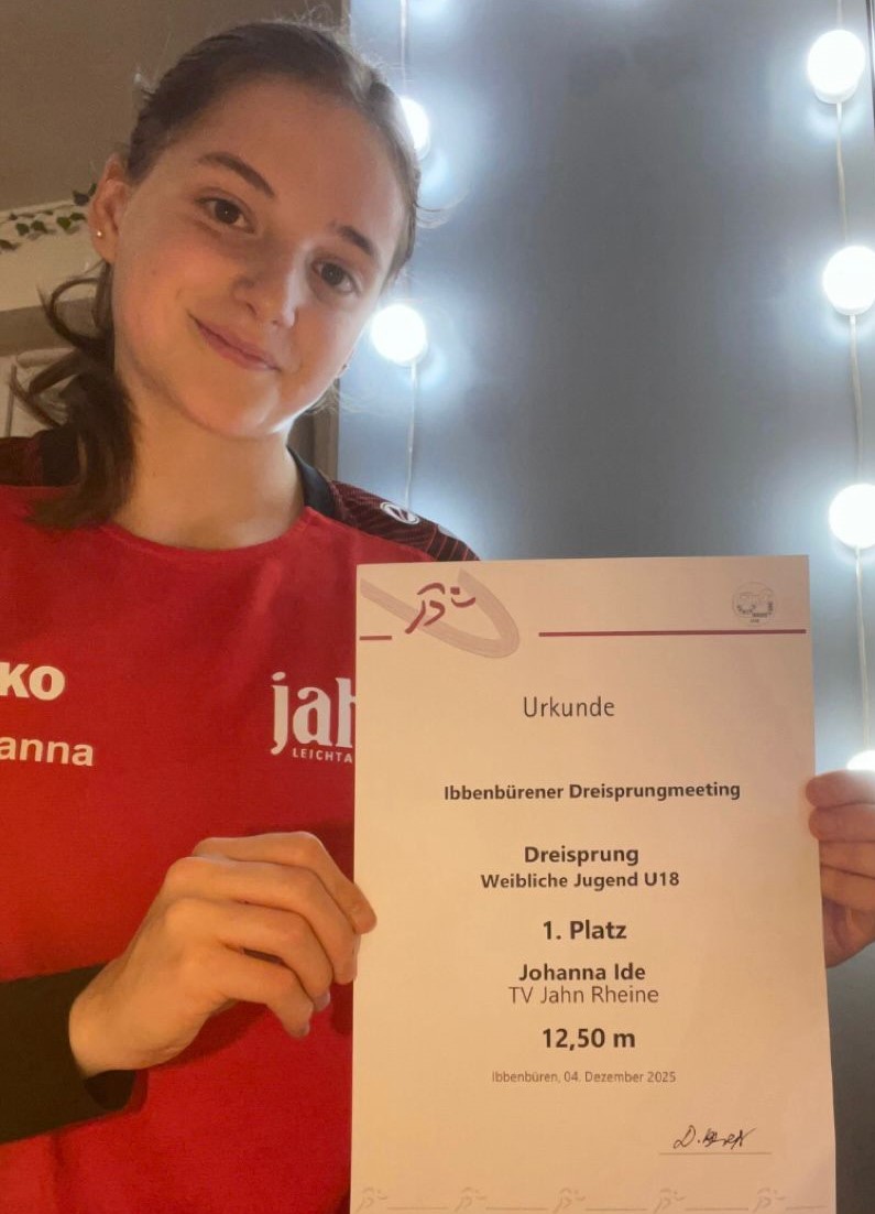 Am vergangenen Donnerstag nahm Johanna Ide (WJU 18) vom TV Jahn Rheine am Dreisprungmeeting in Ibbenbüren teil. Der Wettkampf stellte für sie den Auftakt in die Hallensaison 2025/26 dar und spielt im Anbetracht rar gesäter Dreisprungwettkämpfe eine wichtige Rolle, um sich für die Deutschen U20-Meisterschaften in Sindelfingen am 20.-22.02. 2026 zu qualifizieren. Noch 14 Tage zuvor waren Ide und ihr Trainer aufgrund der bisherigen Trainingsergebnisse sicher, dass Ide die Qualifikationsnorm von 11,90 m problemlos springen würde. Doch gut eine Woche vor dem Wettkampf zog Ide sich unglücklicherweise eine starke Erkältung zu und hatte diese bis zum Wettkampftag noch nicht gänzlich auskuriert. Gemessen an ihrer körperlichen Leistungsfähigkeit war es fraglich, ob es ihr in ihrem angeschlagenen Zustand gelingen würde, die nötige Energie aufzubringen, um die Norm zu erreichen. Die Trainingsleistungen am Montag waren im Vergleich zu den hervorragenden Leistungen in den Wochen davor sehr ernüchternd gewesen und zeigten, dass Ide mehr als einen Meter an ihr bisheriges Trainingsniveau verloren hatte. Dennoch ließ Ide sich nicht beirren. In ihrem ersten Versuch verschenkte sie ein wenig Weite am Brett und konnte den Sprung auf sehr gute 11,85 m ziehen. Im zweiten Versuch schaffte es Ide einen technisch extrem guten Hop-Step-Jump hinzulegen. Die gute Technik kompensierte etwas den starken Kraftmangel und sie flog auf die neue persönliche Bestweite von 12,50 m (vorher 12,26 m). Auch im Folgenden gelangen ihr technisch herausragende Sprünge. Im dritten Versuch zog sie noch etwas an. Der Hop landete bei etwa 5 m und der Step ging dann schon knapp über 9 m, so dass eine noch größere Endweite zu erwarten gewesen wäre, doch leider konnte sie in ihrem angeschlagenen Zustand den Sprung nicht sauber stehen. Sie geriet in eine leichte Körpervorlage und musste daher den Sprung abbrechen. Mit 12,06 m, 12,25 m und 12,13 m in den letzten drei Versuchen zeigte sie trotz stetig steigender Ermüdung drei weitere Sprünge über die 12 m- Marke, die sie bisher erst in einem Wettkampf im Spätsommer übertreffen konnte. Mit den 12,50 m konnte Ide sich den Sieg, den Hallenkreisrekord und Platz 1 in der aktuellen deutschen Hallenbestenliste sichern. Gleichzeitig hat sie die Norm für die deutschen U20-Hallenmeisterschaften abgehakt und als Bonus sogar die B-Norm (12,25 m) für die Deutschen Hallenmeisterschaften der Männer und Frauen in Dortmund zu erzielt, so dass dort ebenfalls die Chance auf einen möglichen Start besteht. Wie hoch ihr Sprung einzuordnen ist, zeigt die Tatsache, dass Ide mit ihrer Weite jetzt Platz 4 der ewigen deutschen Hallen-Bestenliste der WJU18 belegt. Ide und Lange freuen sich nun auf die weitere Saison, da sich beide sicher sind, dass Ide in gesundem Zustand deutlich weiter springen kann. Das Ziel ist es nun gesund zu werden und dann möglichst bald die 13 m-Marke anzugreifen.