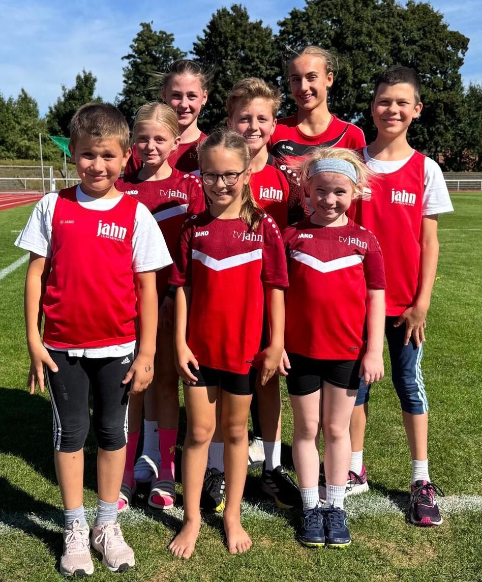 erfolgreiche Mehrkämper(innen) des TV Jahn Rheine (v.l.): hinten: Charlotte Hagedorn, Hannah Brüggemann, Leo Neugebauer, Sanja Terkuhlen, Johanna Ide und Eva Krabbe; vorne: Frieda Fischer, Debora und Shania Klinge und Dörthe Lange